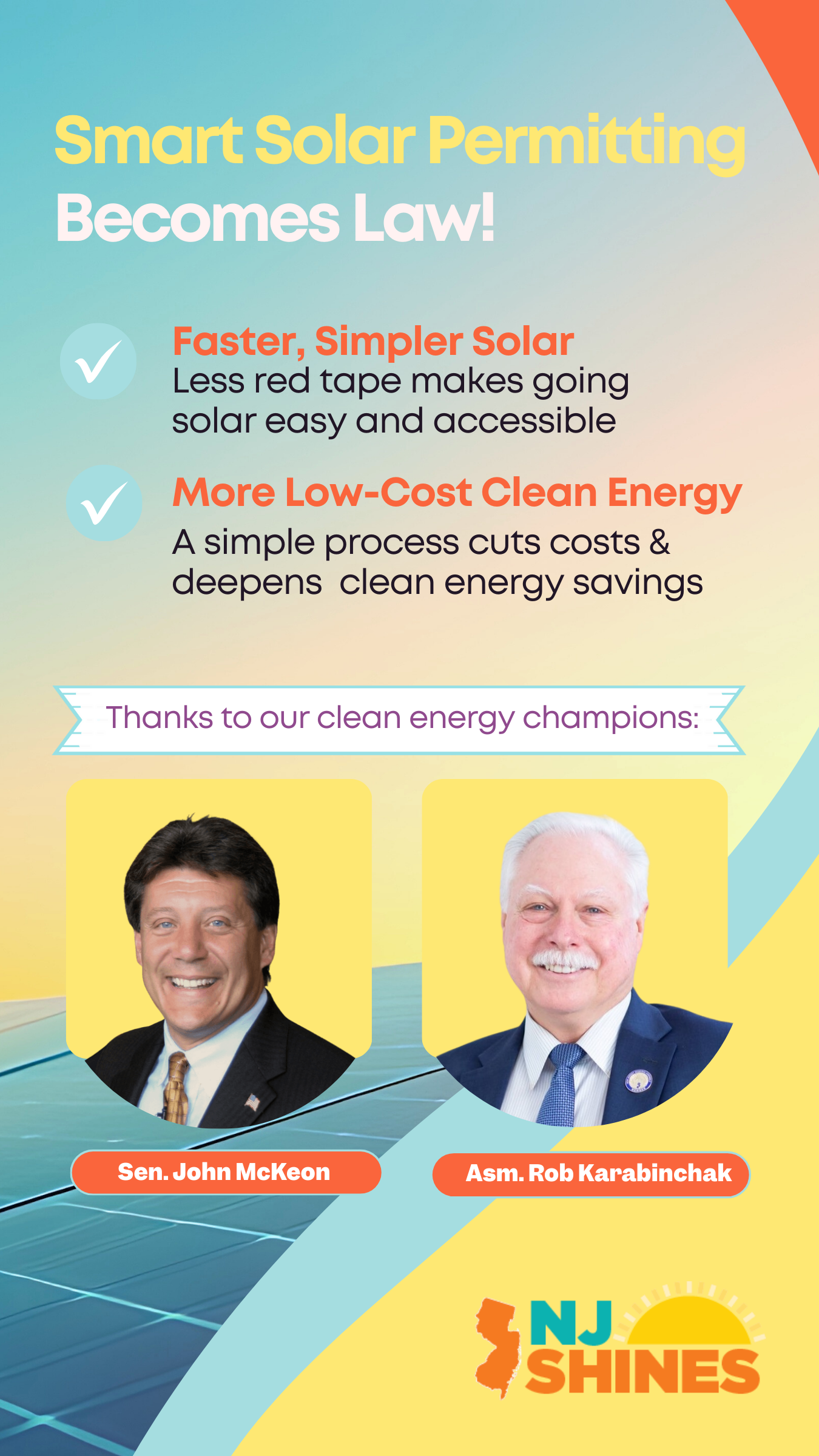 “With energy bills on the rise, reforms like this help us protect NJ communities. We all win by making it easier, faster and more affordable to generate clean energy at home,” said Elowyn Corby, Mid-Atlantic Regional Director for Vote Solar Action Fund. “No one should be locked out of the clean energy transition, but an unwieldy permitting process can do just that. Along with the other members of the NJ Shines Coalition, we’re excited to see this good idea become law – and we’re grateful to Senator McKeon, Assemblyman Karabinchak, and Governor Murphy for making it happen. Let’s hit the ground running with implementation in 2026, and accelerate progress toward a resilient and equitable New Jersey that works for everyone.”